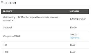 For a limited time, score a Get Healthy U TV Premium Membership for only $3 for your first full year — a $76 savings. You’ll get unlimited access to workout videos, calendars, healthy recipes, plus 24/7 access to their fitness experts.