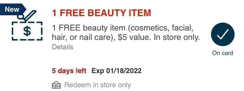 If you received a store coupon for a free beauty item, it’ll stack with this deal. Make sure to check your account for the expiration date of your coupon. Mine expires on Jan. 18, but this can vary from person to person.