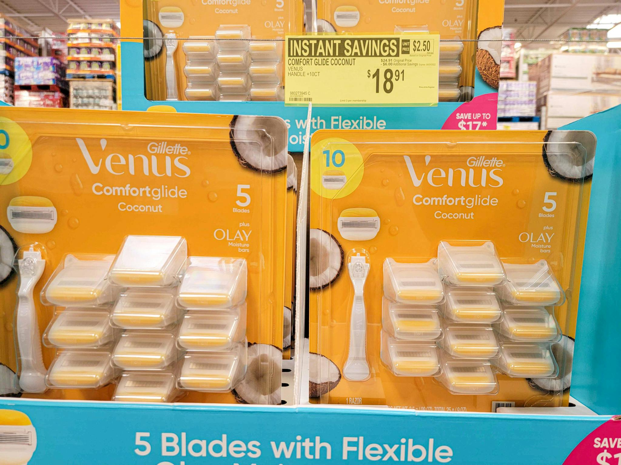 Stock up on Gillette Venus ComfortGlide Razors with this great deal at Sam’s Club. Normally $34.98, these Olay Coconut razors are on clearance for $24.91, with an extra instant savings of $6 coming off the price, making it only $18.91. You’ll get a handle and 10 blade refills with this deal. Shop in the club or online with free curbside pickup for Plus members to get this deal.