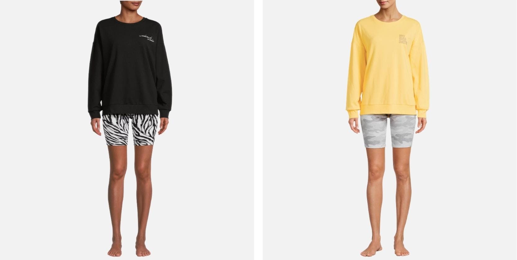 Looking for a great outfit to just lounge around in? Shop online at Walmart.com to score a 2-piece set for only $7. It includes a long sleeve top and bike shorts in several print options.
