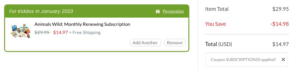 Bottom-line cost: Monthly kits are $29.95. With code SUBSCRIPTION50, you’ll get 50% off all monthly subscription activity kits and free shipping. The final cost will be $14.97.