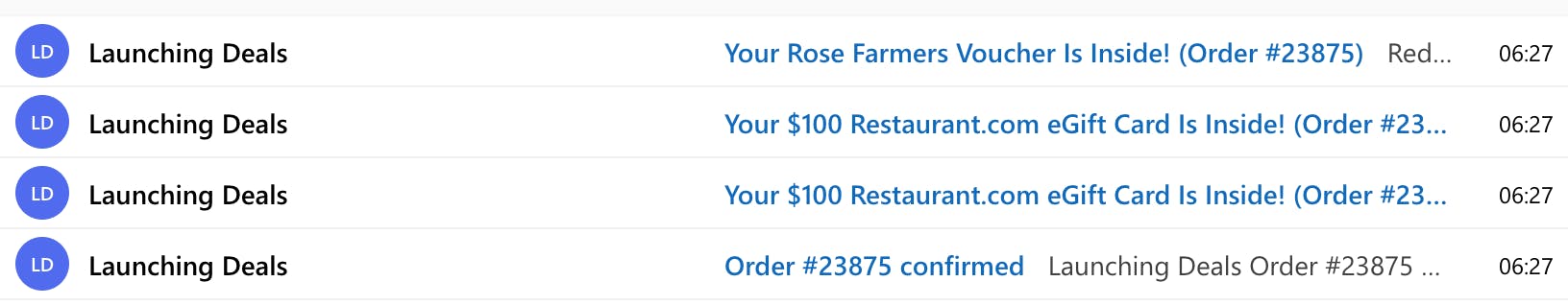 - Note that you’ll immediately get four emails from Launching Deals: an order confirmation, two separate emails with your $100 eGift Cards, and a RoseFarmers.com $40 voucher.