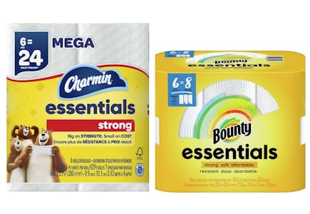 - Purchase three packs of your choice: Bounty Essentials paper towels and/or Charmin Essentials toilet paper.