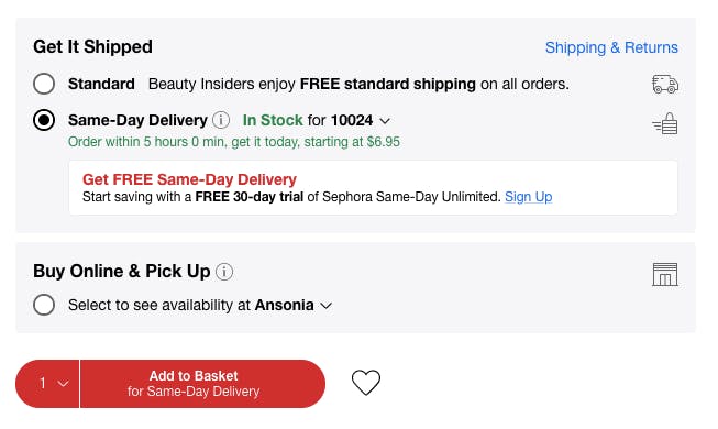 Sephora is offering free same-day delivery with code FREE4VDAY at checkout.