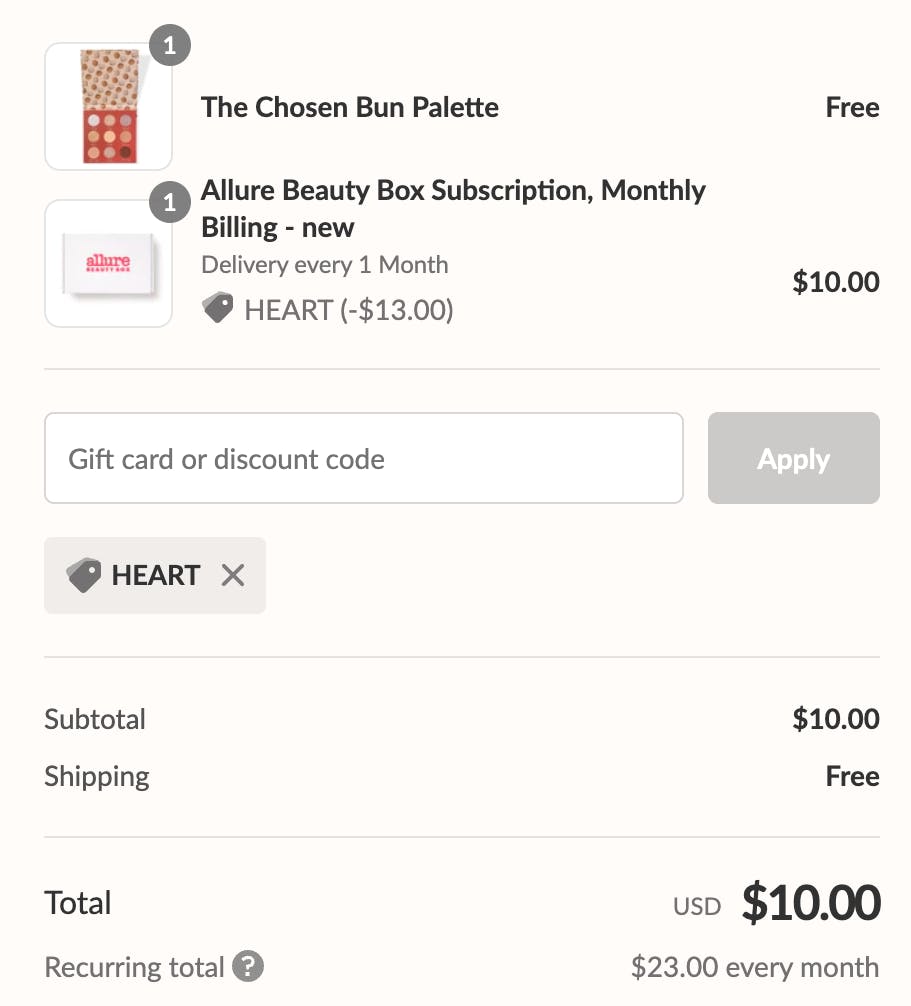 If you enjoy trying new beauty products but don’t want to pay full price for items you’re not sure you’ll love, I found a great deal on Allure Beauty Box subscriptions. You can get your first box for just $10 shipped with code HEART.
