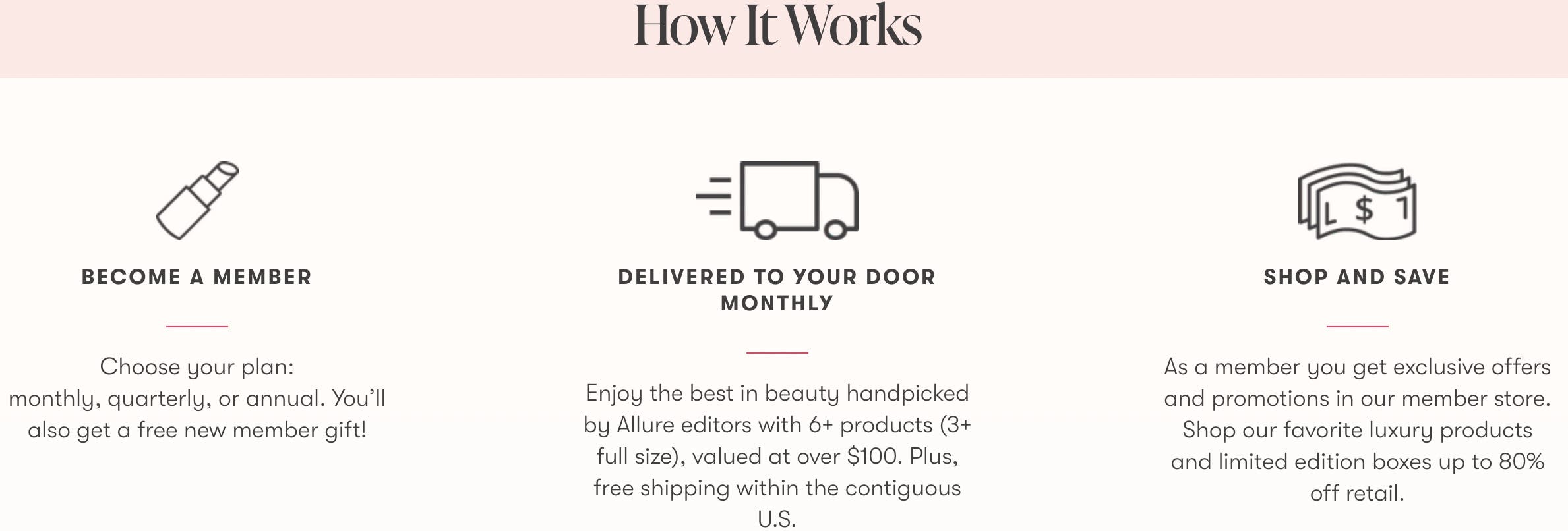 Allure Beauty Box is a subscription service that allows members to try new beauty products for a small membership fee. Products are hand-selected by the editors, and each box contains six or more products (valued at $100+) for members to try. Members also have access to exclusive discounts on products in the member store, as well as access to limited-edition, discounted boxes.