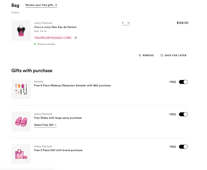 To get this deal, log into your Ultimate Rewards account, add one full-sized fragrance to your cart from this page, click on your cart, scroll down to “gifts with purchase” and apply them to your cart — don’t forget to select a size for your Juicy Slides.
