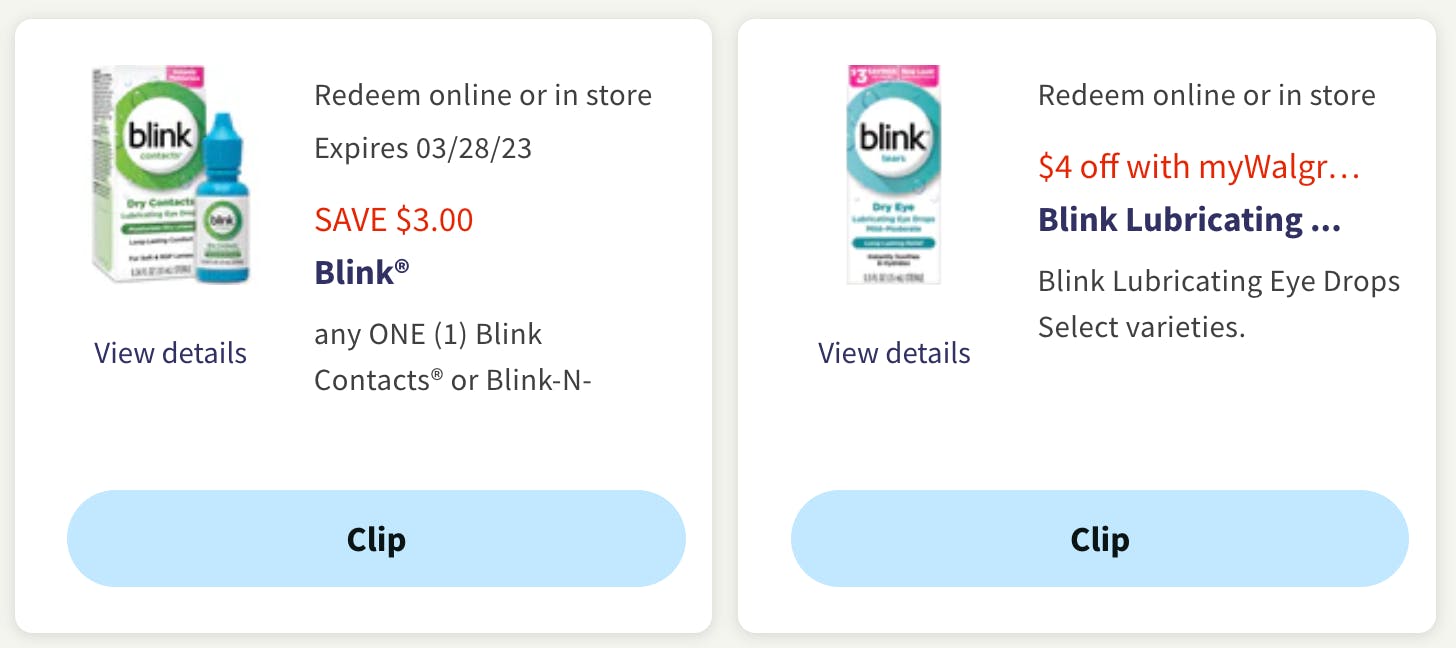 Walgreens sells the 0.34-ounce bottle of Blink Contacts Lubricating Eye Drops for $7.99. Just enter the phone number tied to your myWalgreens account at the register to save a total of $7. Your final price will be only $0.99.