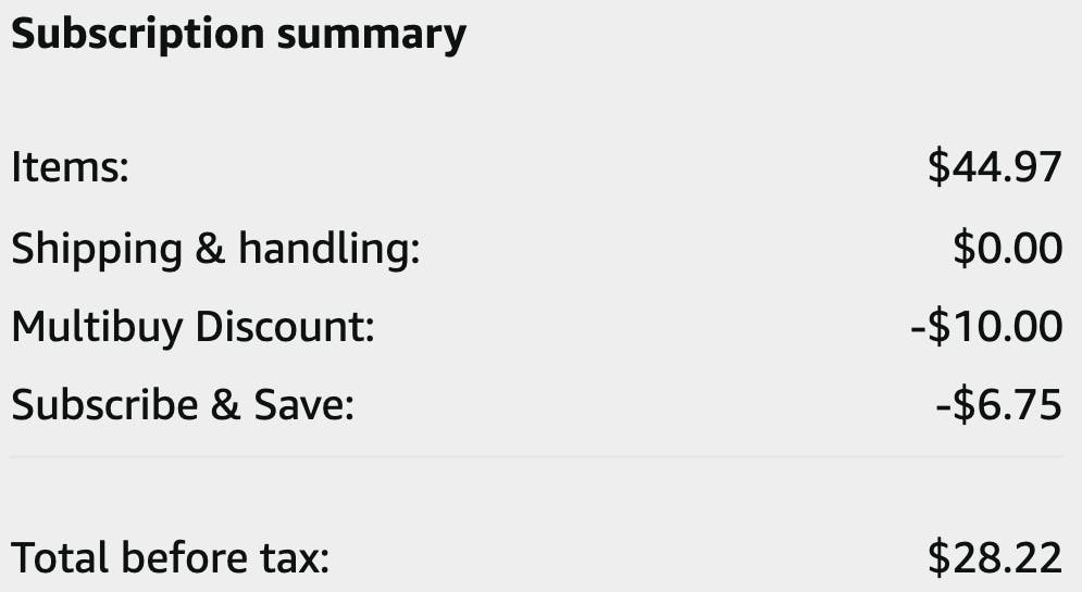 - Check out using Subscribe & Save to apply an additional 5% -15% discount. (To receive the 15% discount, be sure you’re subscribed to five or more items for the month.)