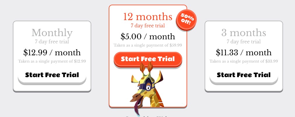 Your kids can try Night Zookeeper for free for seven days. There are then options to pay for the program on a monthly, every three months, or yearly basis. The most cost effective option is to pay for a full year in advance for $59.99 (or $5 per month) which is a 50% savings from the monthly cost.