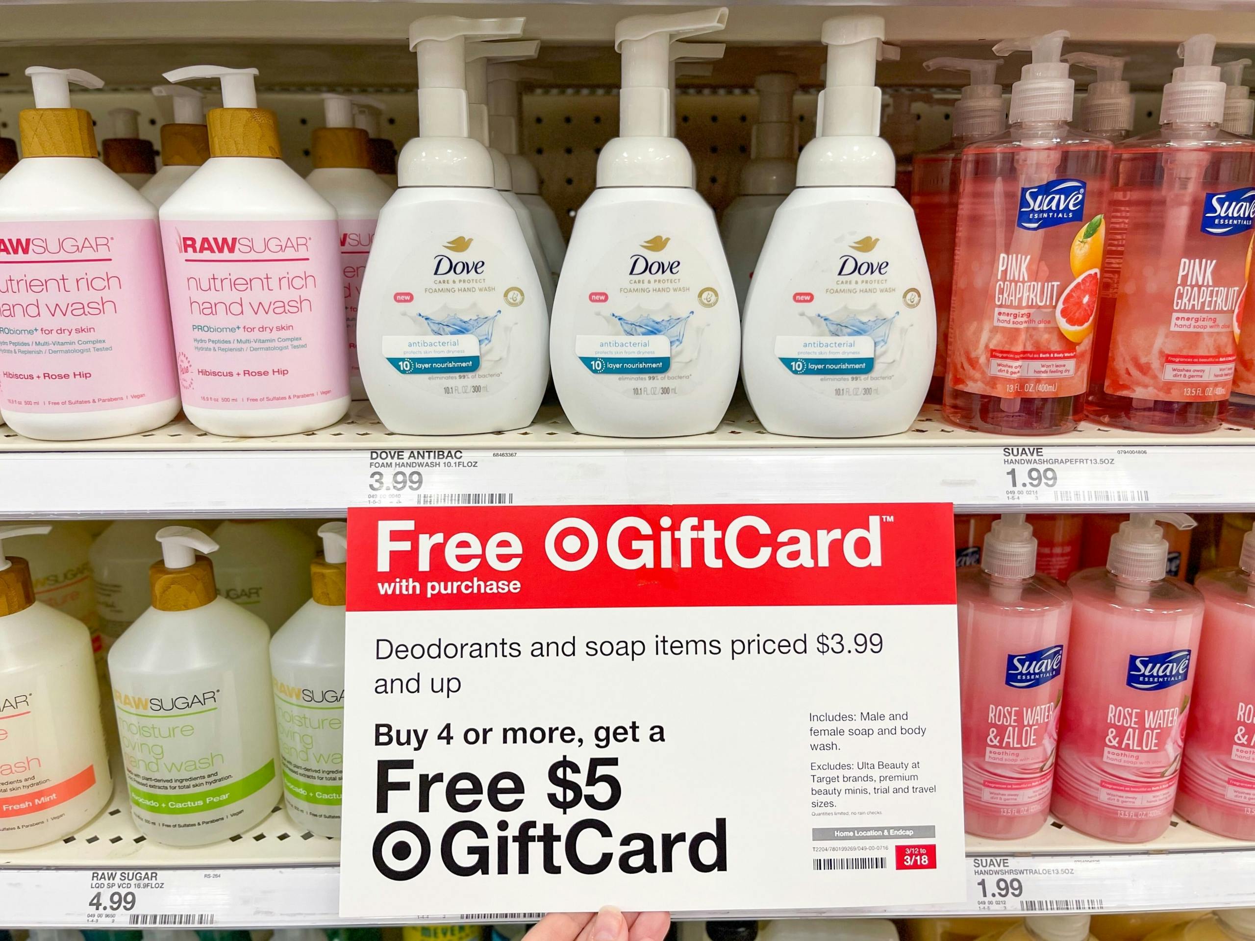 Save over 50% on Dove Hand Wash with this all-digital savings deal at Target. Purchase four bottles and receive a $5 Target gift card. Clip a 15% off Dove coupon in the Target app (download) or directly to your account online. Next, look in your Fetch Rewards app (download) for a $0.50 Dove Hand Wash rebate that can be redeemed up to five times. Rebate offers do vary by user, so it’s important to verify that you have the offer before making your purchase.