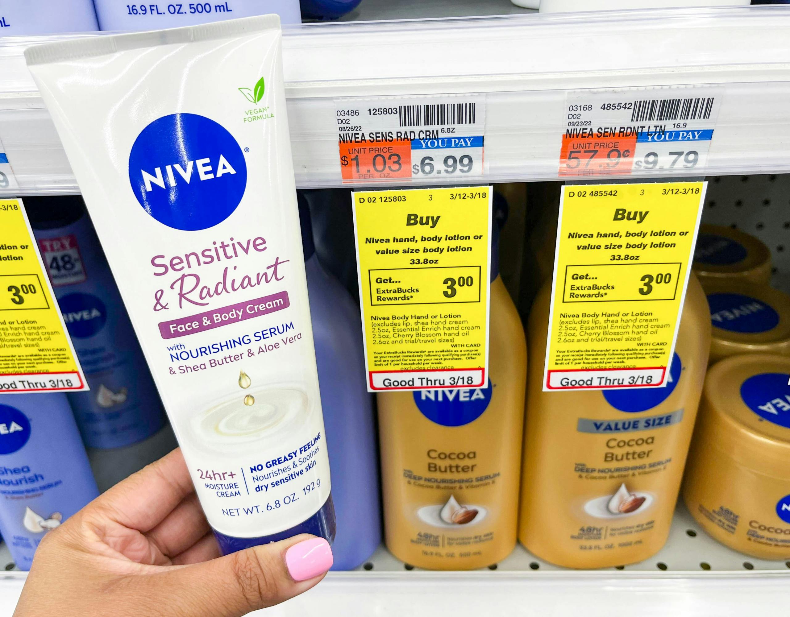 Save on Nivea Sensitive & Radiant Face & Body Cream at CVS. Sign up to be an ExtraCare member and you’ll receive $3 in ExtraBucks when you purchase one Nivea hand or body lotion. You can save even more with a mobile coupon available on the CVS app. Just download the app and look for the $2/1 digital coupon for Nivea. Purchase one Nivea Sensitive and Radiant face and body cream for $6.99. Pay $4.99 at the register after the coupon applies, and receive $3 in ExtraBucks to use on your next purchase. Your final price will be $1.99.