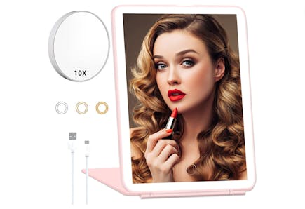 “It’s a pretty decent size to have along for travel!! The compact-sized circle mirror is the magnifier and can be attached by suctioning onto the bigger mirror! It can also be put in your purse! The light options are great! It stands up firmly on the cover…and it’s thin enough to slide into the side of a laptop bag! The box it comes in is a bonus! It’s the perfect gift box!”