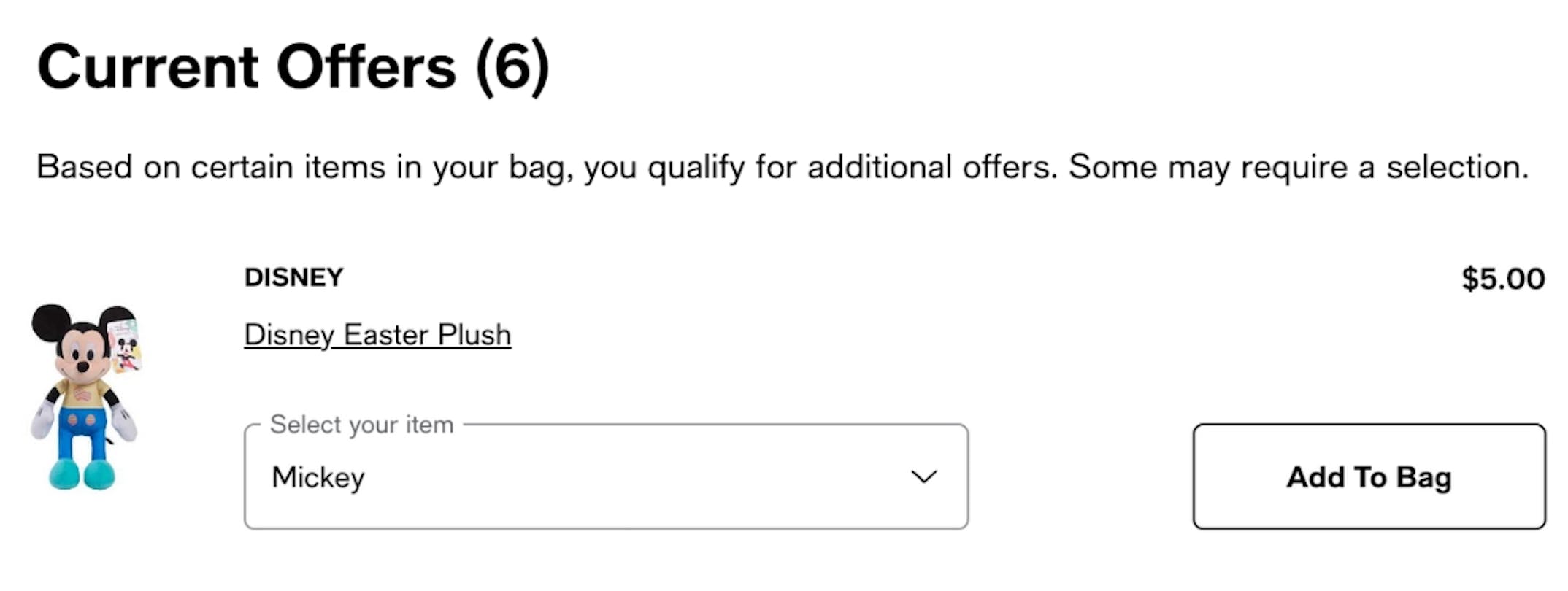 Scroll down in the shopping cart page to see the Disney Easter Plush under “Current Offers,” choose Mickey or Minnie Mouse, and then add it to your cart.