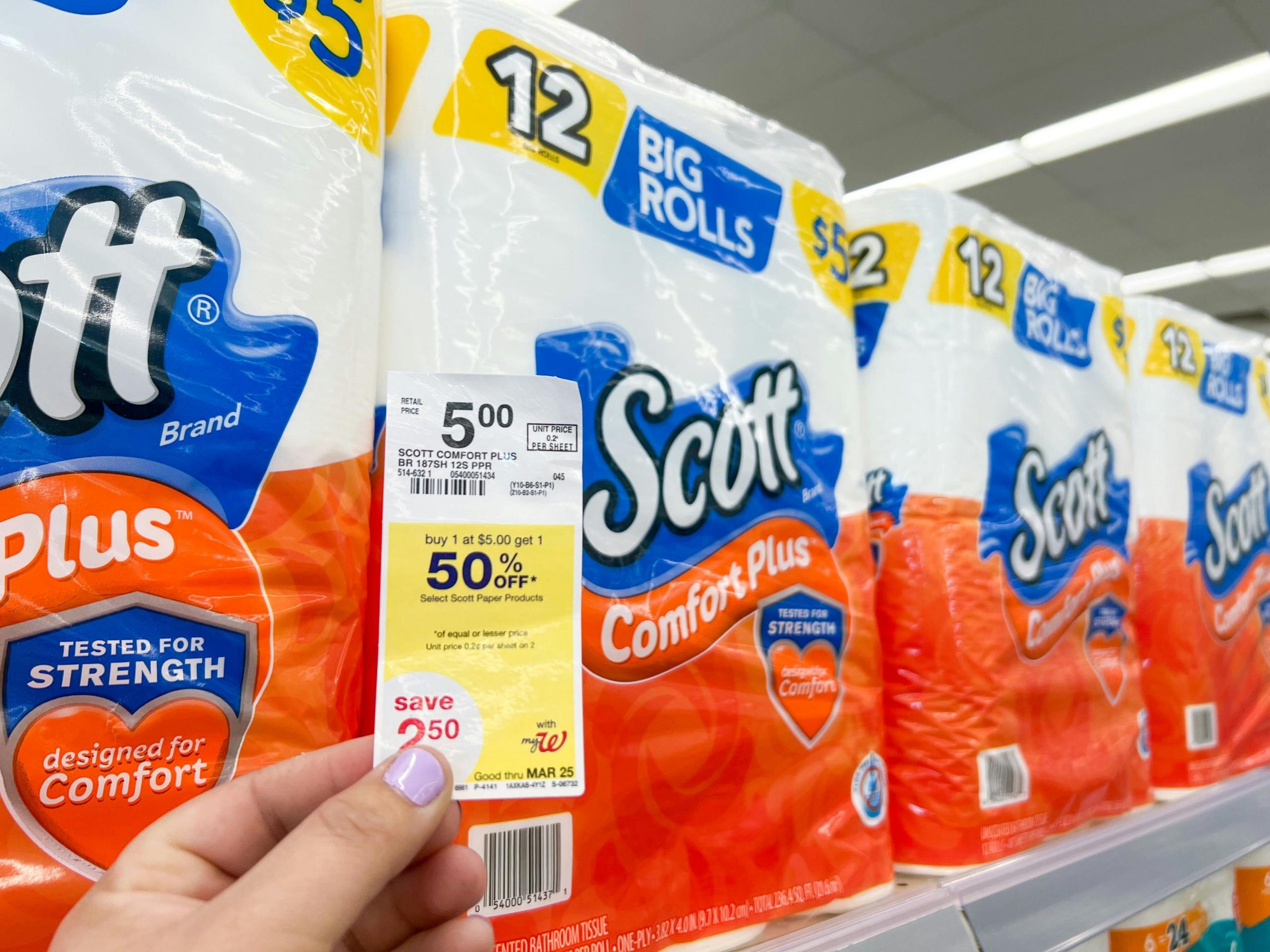 To score this deal, purchase two packages of Scott Toilet Paper, on a buy one get one 50% off sale, and use the coupon code WAG10 at checkout for an additional 10% off. You’ll also need to be logged into your myWalgreens account to get a $1.00/1 Scott Bath Tissue coupon.