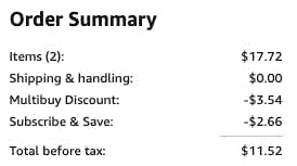 Please be aware that discounts will vary by account and product. Your first subscribe & save order will receive the minimum discount and when you have five or more subscriptions shipped to the same address, you’ll unlock the maximum discount.