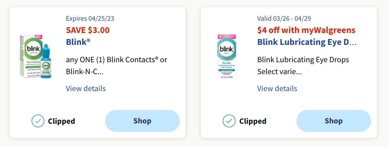 The Blink Contacts Lubricating Eye Drops cost $7.99 for a 0.34-ounce bottle, but by providing your myWalgreens account phone number at checkout, you can save a total of $7 with the two coupons and pay only $0.99.