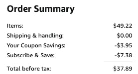 Please be aware that discounts will vary by account. If this is your first Subscribe & Save order, you’ll get the minimum discount. When you have five or more subscriptions shipped to the same address, you’ll unlock the maximum discount.