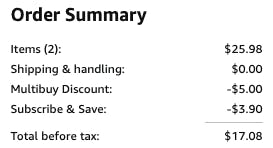 You’ll get a great deal when you check out with Subscribe & Save for 5% or 15%. When you meet the spending threshold of $25, you’ll get an extra $5 off your total.
