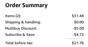 When you place your first Subscribe & Save order, you’ll get the minimum discount that’s listed for your item. Then when you have five or more active subscriptions shipped to the same address, you’ll unlock the maximum discount to save even more.