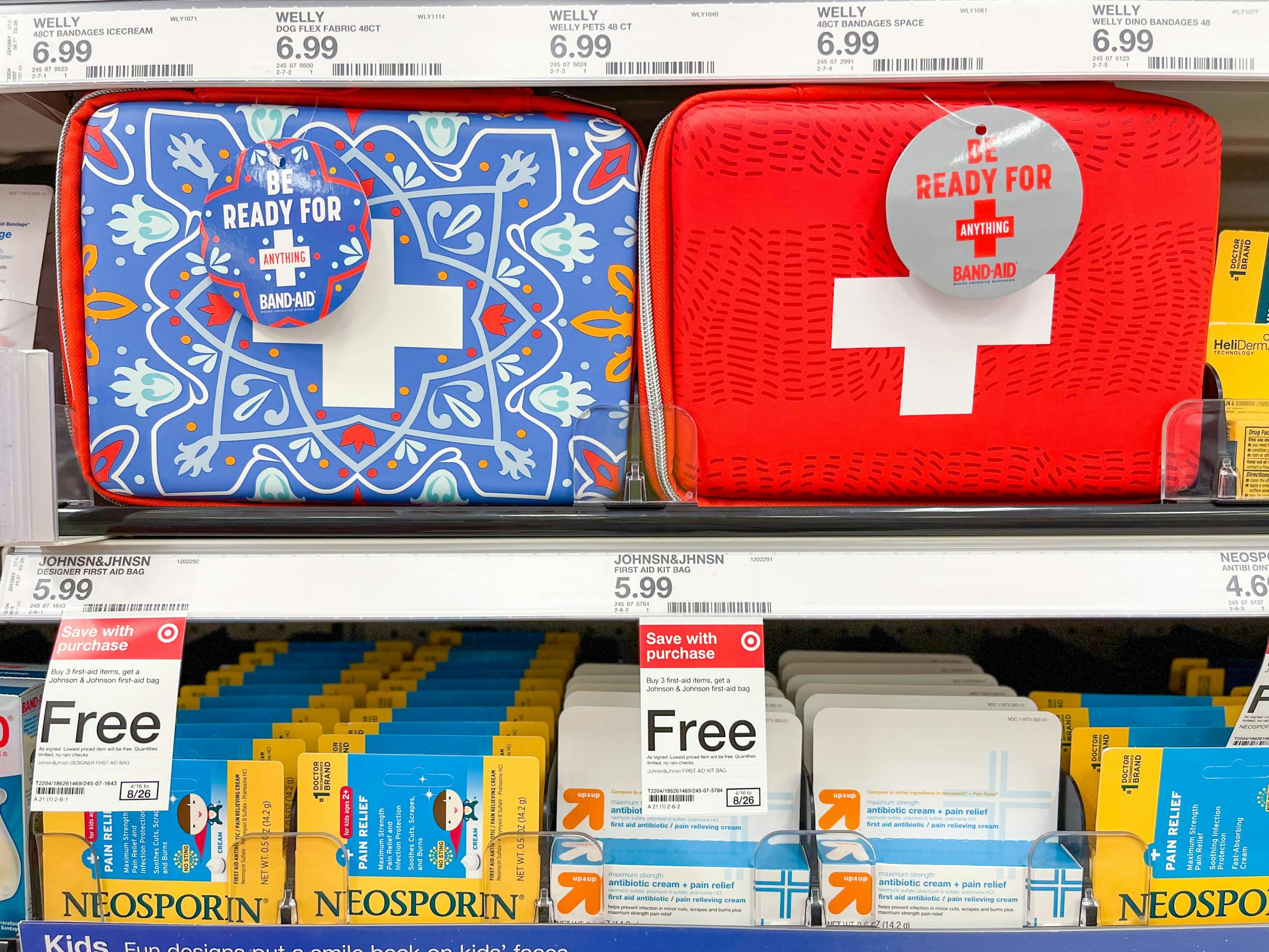 Buy three boxes of Band-Aids at Target and get a free first-aid bag. You can purchase a wide variety of first-aid items to get the free bag, but we found the 10-pack of gauze to be the least expensive.