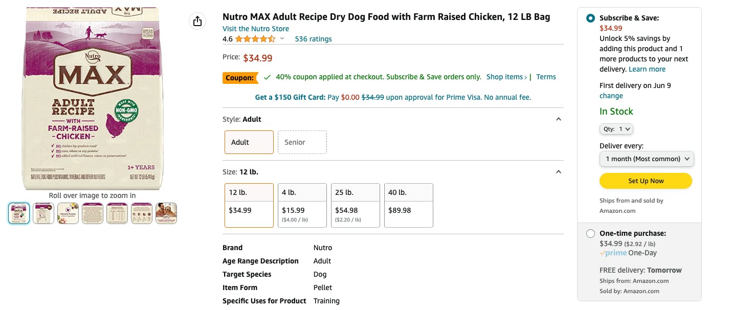 Get online to Amazon for coupons on Nutro Dog Food. Select accounts will have a $20 or 40% off Subscribe & Save coupon on select varieties. If you have one of these coupons, be sure to clip the coupon and check out with Subscribe & Save. Score a 12-pound bag of Nutro MAX Adult Recipe Dry Dog Food for as low as $19.24. Or get the Nutro Ultra Senior High Protein Natural Dry Dog Food 30-pound bag for as low as $44.99 (normally $89.98).