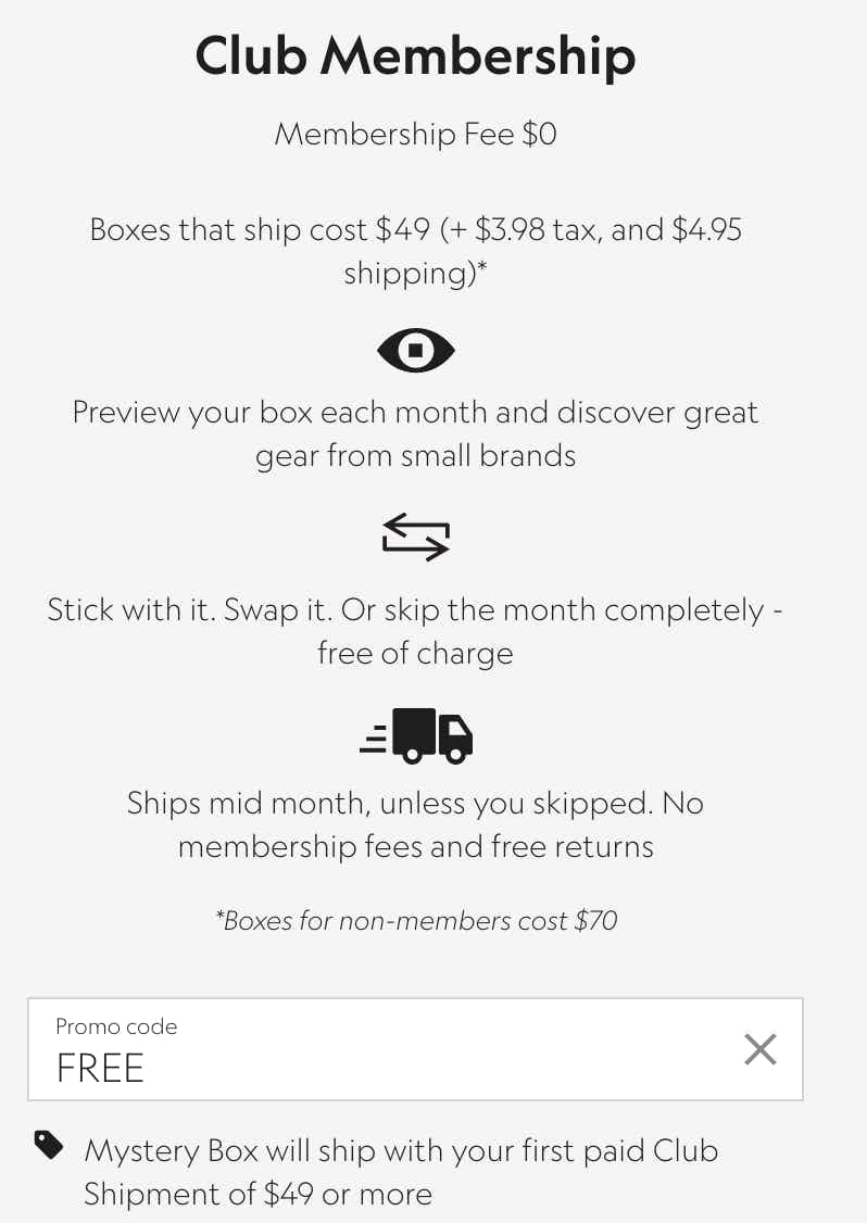 - Use coupon code FREE to get a free mystery box tacked onto your first member order.