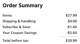 If this is your first Subscribe & Save order, you won’t get a discount. But when you have five or more subscriptions shipped to the same address, you’ll get the maximum discount (for this order, that’s 5%).