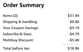Multi-buy discounts are also a great way to stock up and save money. If you’re looking to start a stockpile, this is one of the best ways to do so. If you don’t need two or the same thing, you can shop for more eligible items here and once you meet the spending threshold of $25, you’ll get the $5 discount.