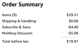 - Add three to your cart. When you meet the spending threshold of $25, you’ll get an extra $5 in savings.