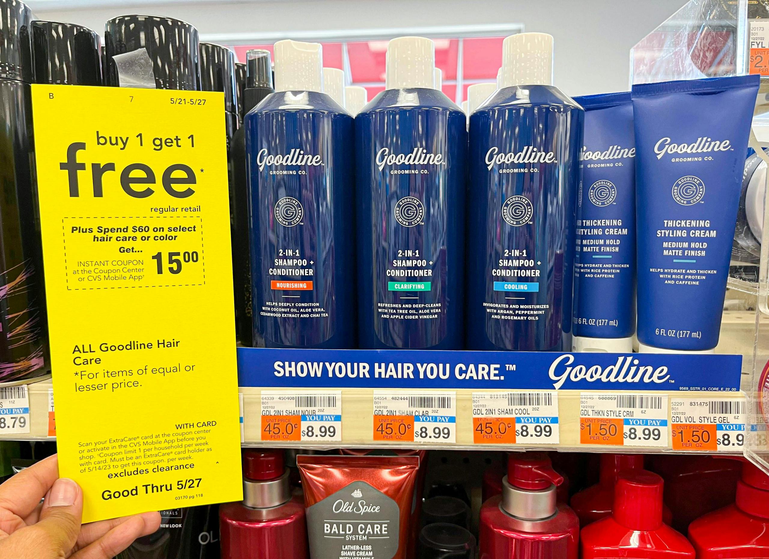Here’s an easy deal at CVS that anybody can do. Goodline Grooming Co. hair care products are on sale buy one get one free. No coupons are required, but you do need to have a CVS account. Don’t have one? Don’t worry, signing up for an account is completely free. Once you sign up for an account, add two products to your cart, and enter your phone number on the pinpad at the register. The sale price will then apply to your purchase, leaving you to pay $4.50 each. You’ll be saving 50% on two products, and you didn’t even need to use a coupon to do it.