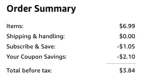 By subscribing you’ll get a minimum discount on your first Subscribe & Save order, and when you have five or more subscriptions shipped to the same address, you’ll unlock the maximum discount.