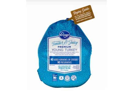 Shop at Kroger to score savings on whole frozen turkeys through Nov. 23. Spend $125 or more in a single transaction, and you'll get one whole turkey for free. There's a limit of one free turkey per Shopper's account. If you need to purchase any additional turkeys or aren't spending $125 to receive the free turkey, you can spend just $25 and get a whole turkey for $0.49 per pound. There's a limit of three whole turkeys at the $0.49 per pound sale price per Shopper's account.