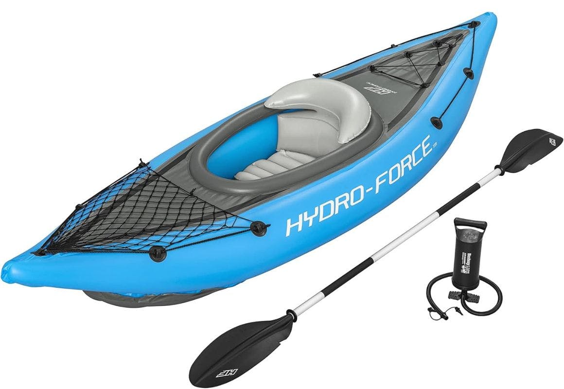 Take a look at this kayak set on Amazon that's on sale for $43.91 (regularly $129.99). You'll get one kayak, one paddle, one hand pump, two fins, one carry bag, and one repair patch.