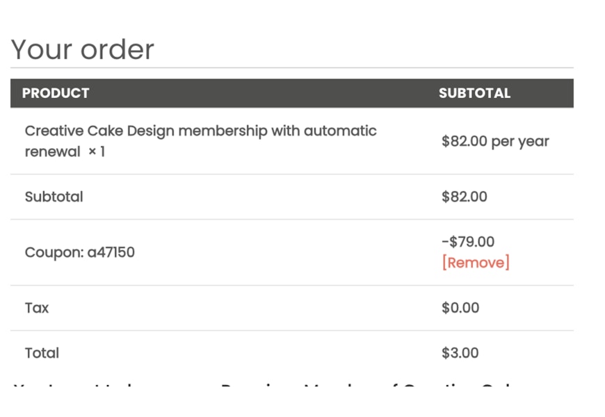 Will I need to cancel? When you purchase this annual membership, it'll be valid for one year. At the 1-year anniversary, it'll automatically renew for another year. If you'd like to cancel, you can email them at creativecakedesign@program-director.net or call them at 1-833-363-1239. You can also go directly to your account online and cancel that way.