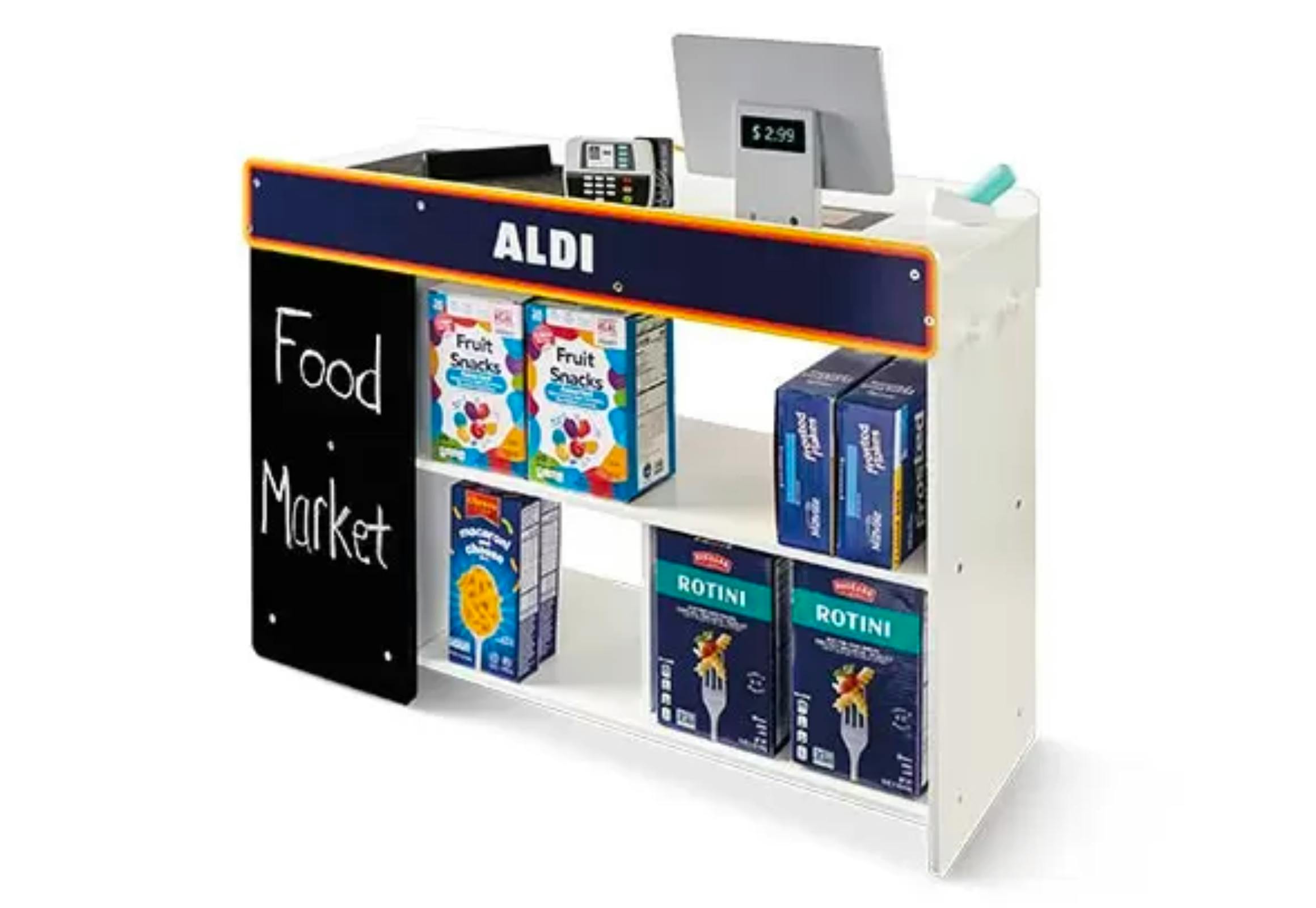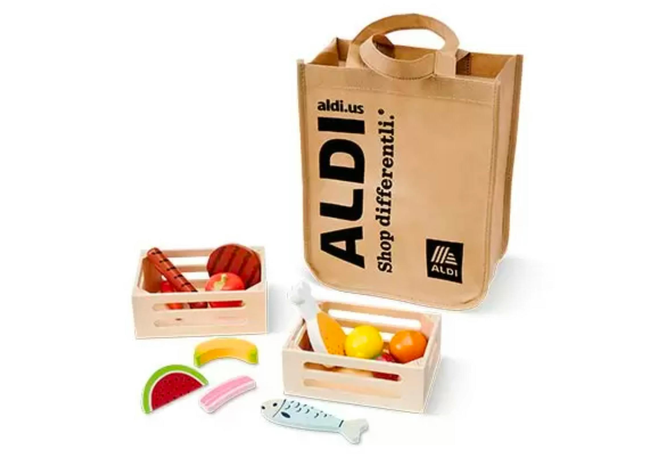 The play shopping set, which includes the wallet and basket set, grocery set, and food crates and bag set, is priced at $12.99. The Aldi shopping cart is $14.99, and the Aldi food market set is priced at $39.99. The conveyor belt actually moves, and the set includes three chalks, nine coins, a credit card, a credit card machine, eight food boxes, a food market, 12 paper money, a product divider, and a wooden scanner.
