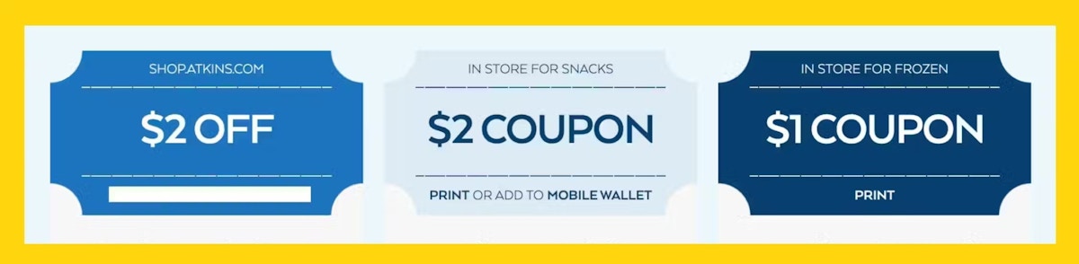 Get $5 worth of free Atkins coupons. No credit card information is required. You just need to sign up to get your free coupons.