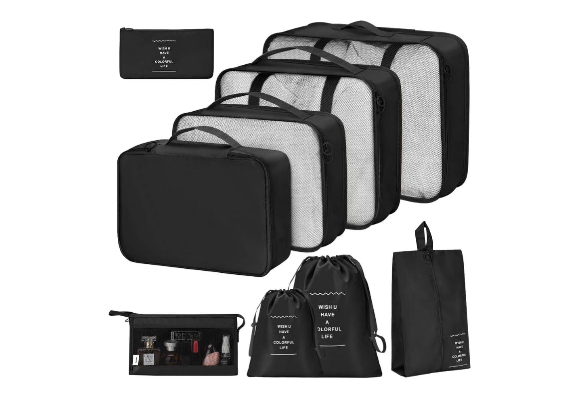 The set comes with an underwear bag, a clothes bag in small, medium, and large, an accessories bag, shoe bag, toiletry bag, and a small and large laundry bag.