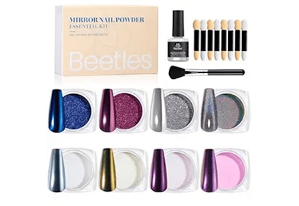 Amazon has these Beetles manicure kits for as low as $8.99. One kit comes with the necessary tools to apply the chrome nail powder and the other kit comes with 240 soft gel tips along with a UV lamp.