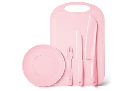 The knife set includes a cutting board, two plastic knives, a plate, and a fork. The plastic is BPA-free.