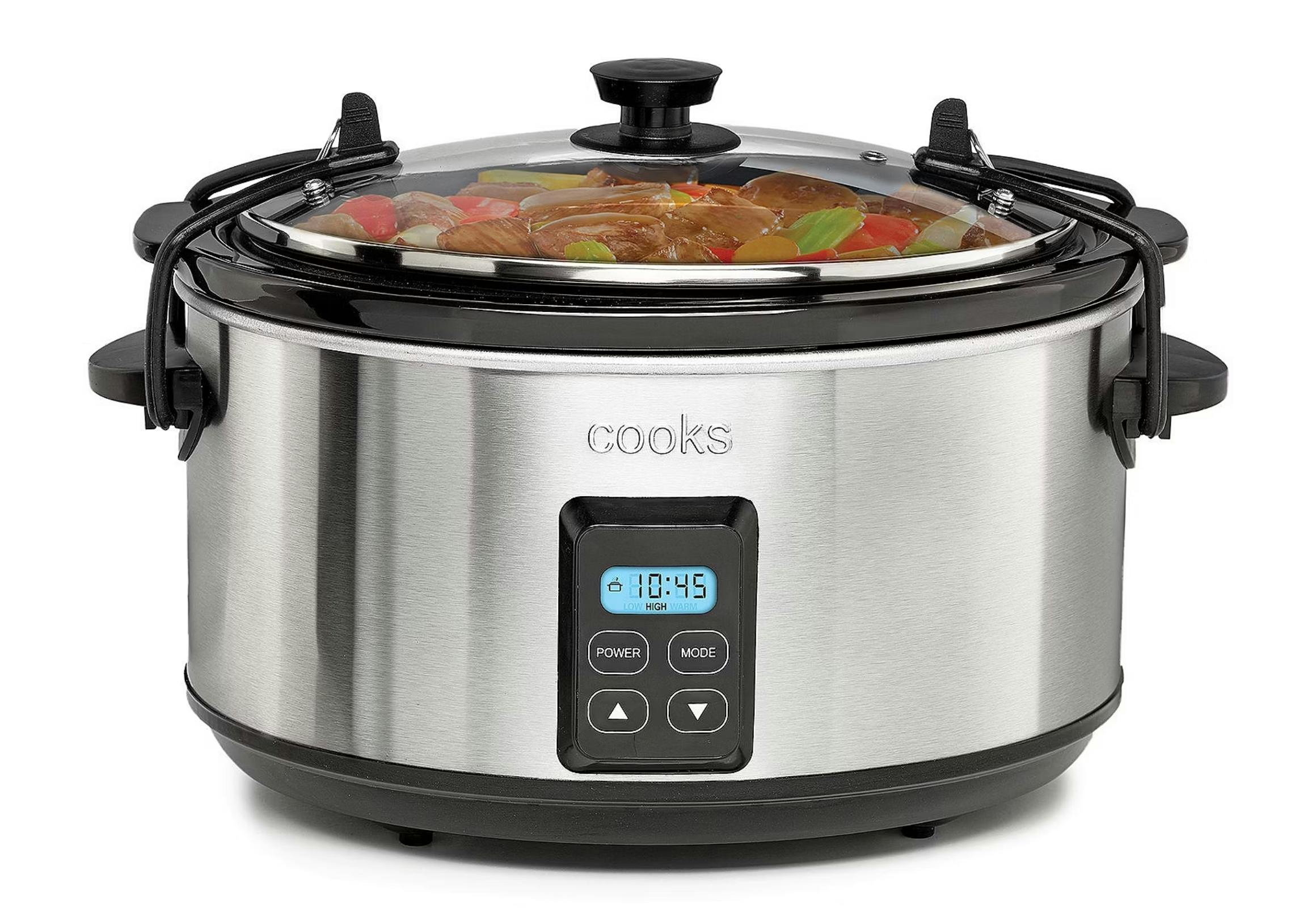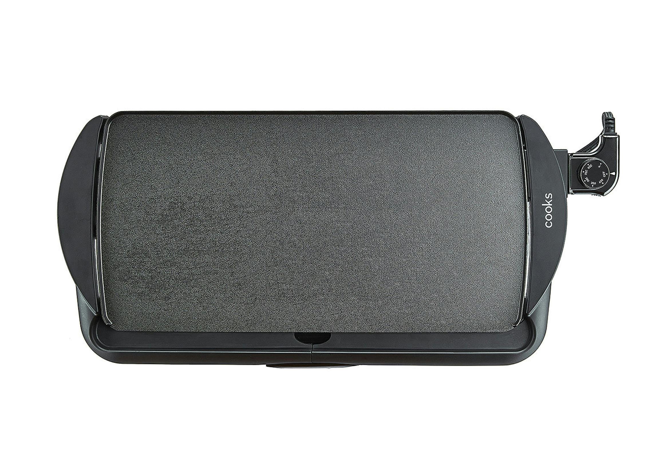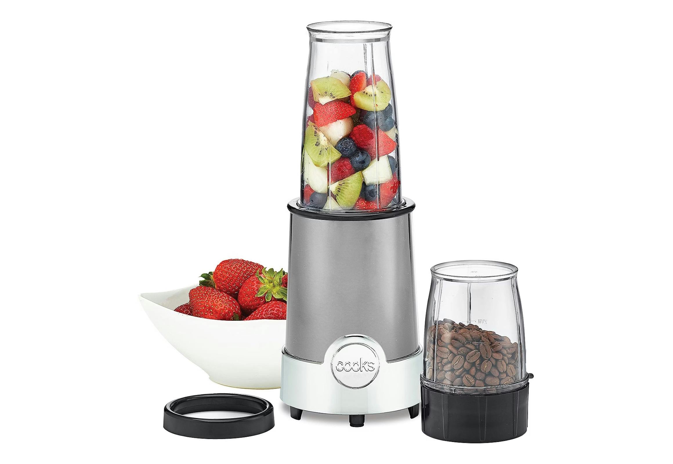 The Cooks 5-in-1 blender comes with one large cup, one small cup, and one lid. It chops, grinds, mixes, whips, and blends.