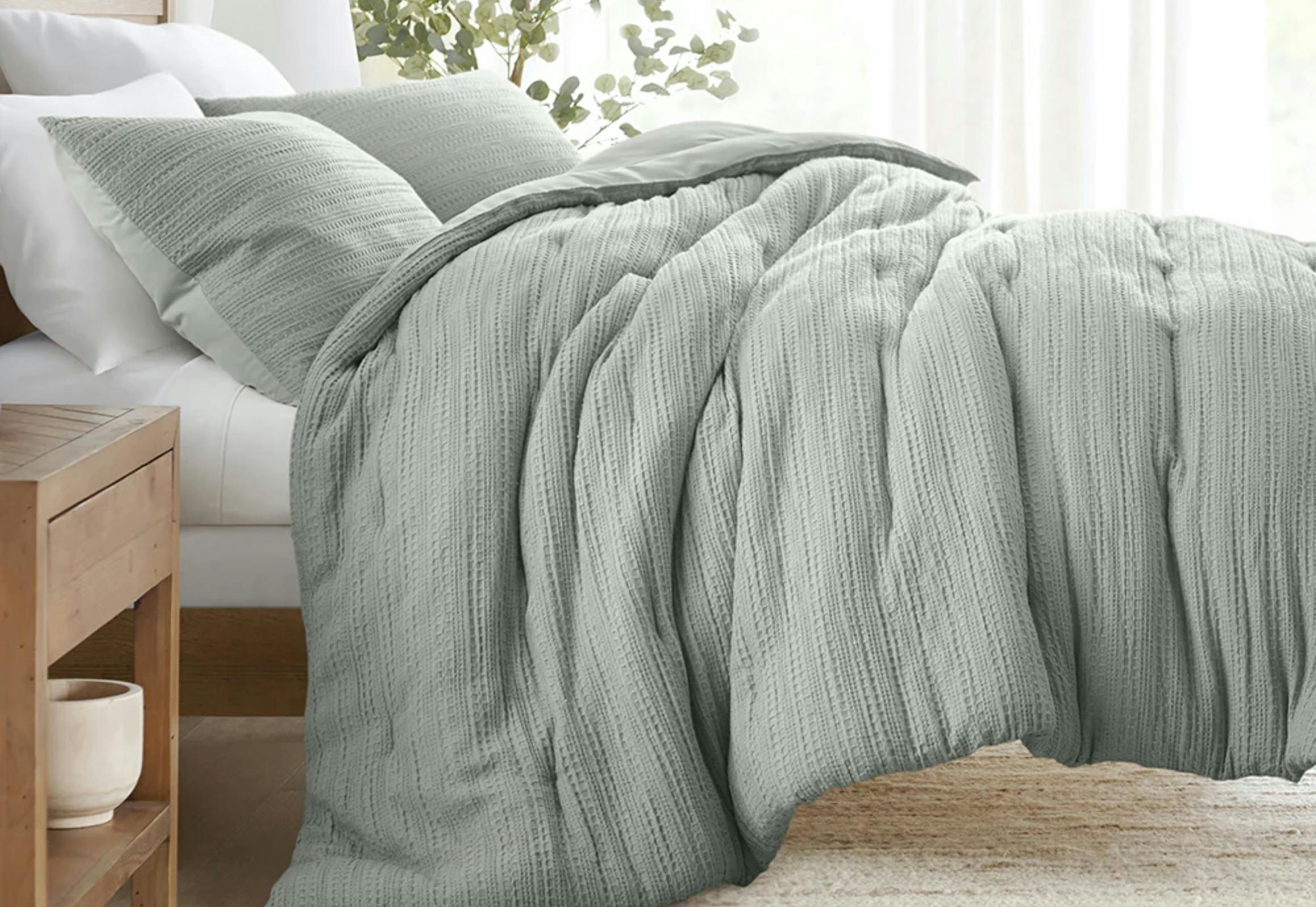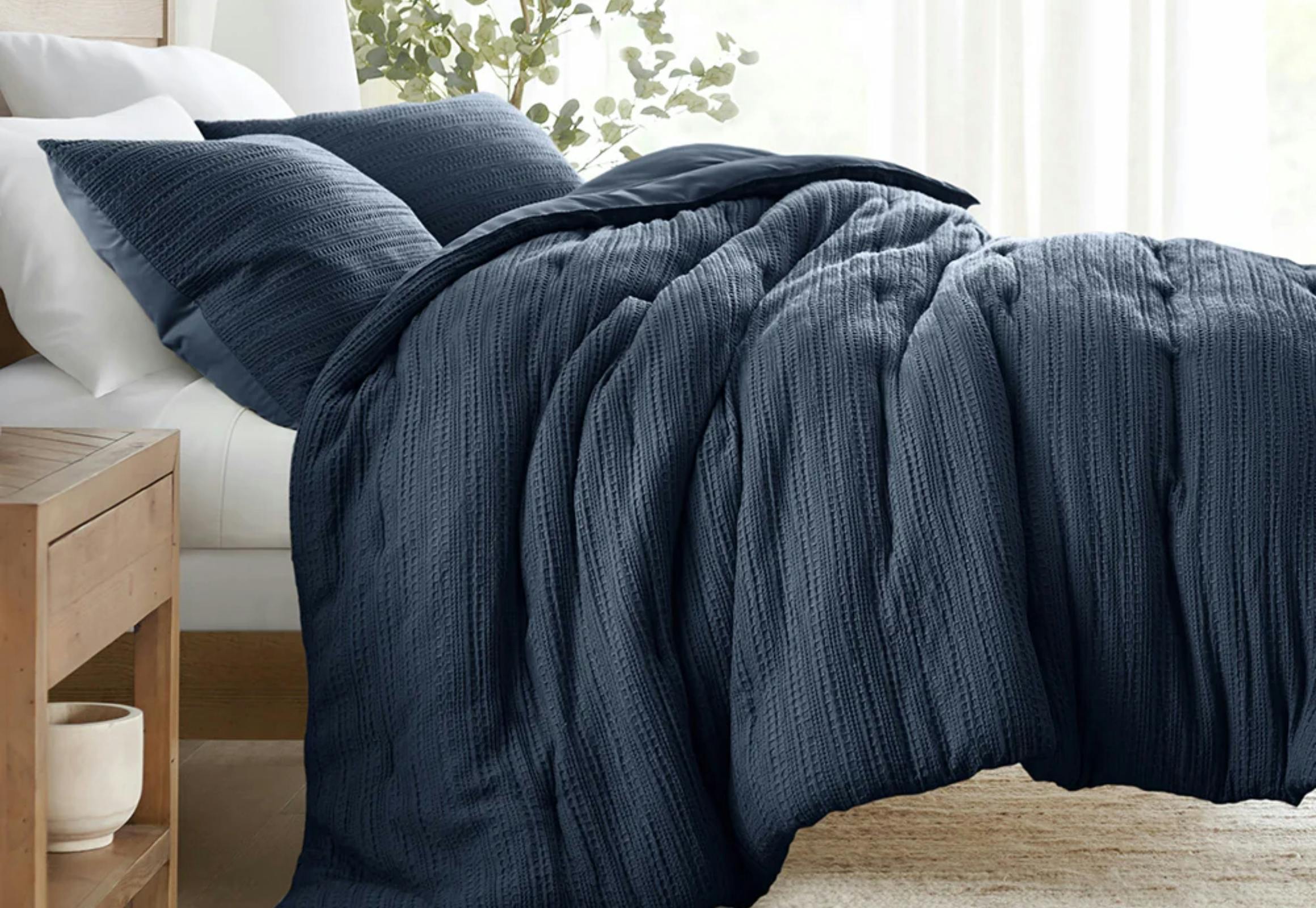 This set includes one comforter and two shams, except for the twin set, which has one sham. It features a waffle texture and is filled with polyester.