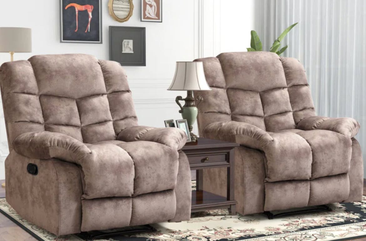 At Wayfair, I found a set of two overstuffed recliner chairs for just $410. This set was originally priced at $839.98 or more. I also spotted a set of two vegan leather recliner chairs for as low as $500. These chairs would regularly be $670 or higher.