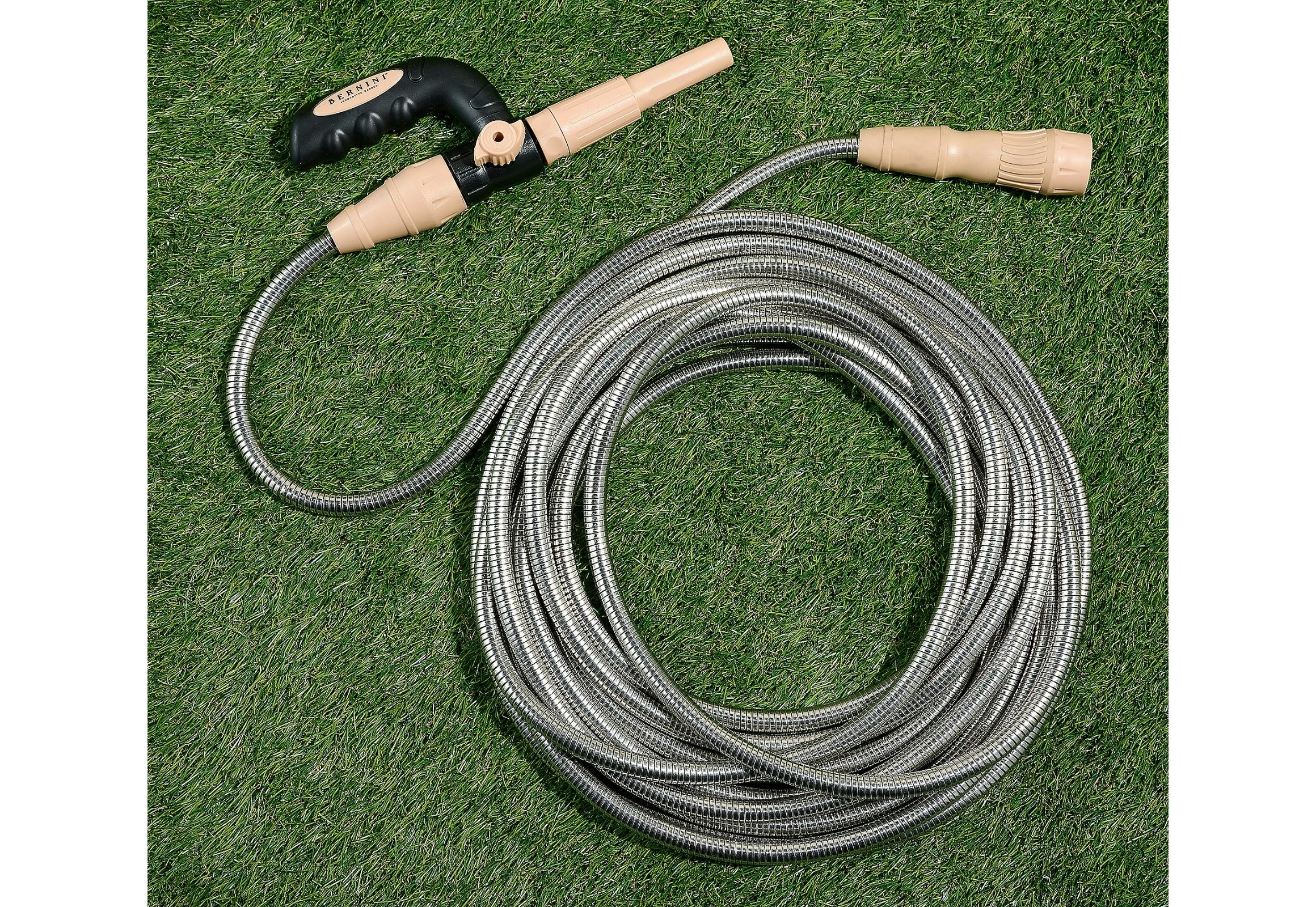 This hose is kink-free and 50 feet long. It also comes with a fireman-style nozzle so you can adjust the pressure. It's also corrosion-, puncture-, and UV-resistant.