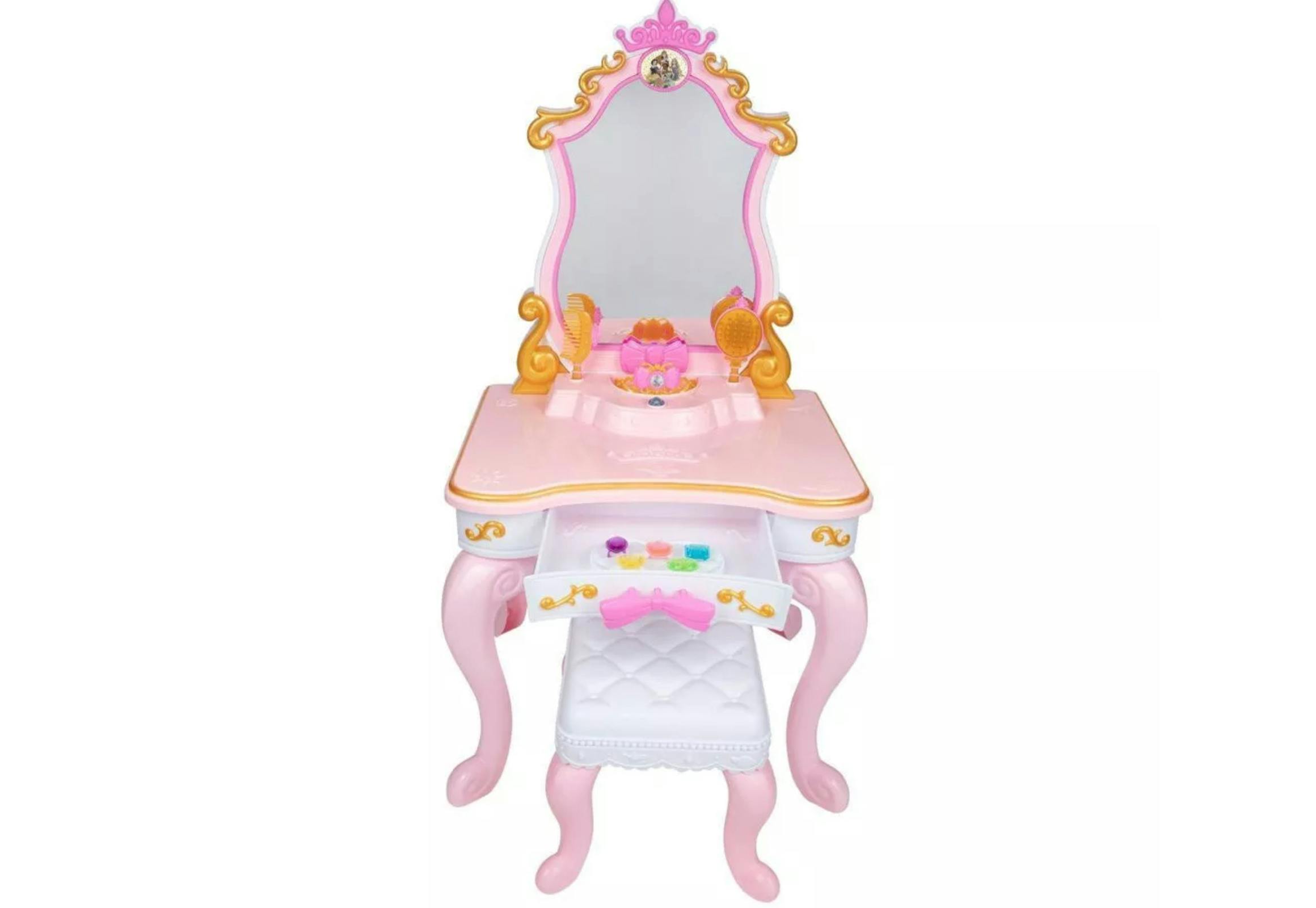 This vanity includes 16 positive messages from Disney princesses. The accessories trigger the messages and sound effects. It comes with a stool, a tiara, a brush, a comb, five elastic bands, and five rings. Three AA batteries are required but are not included.