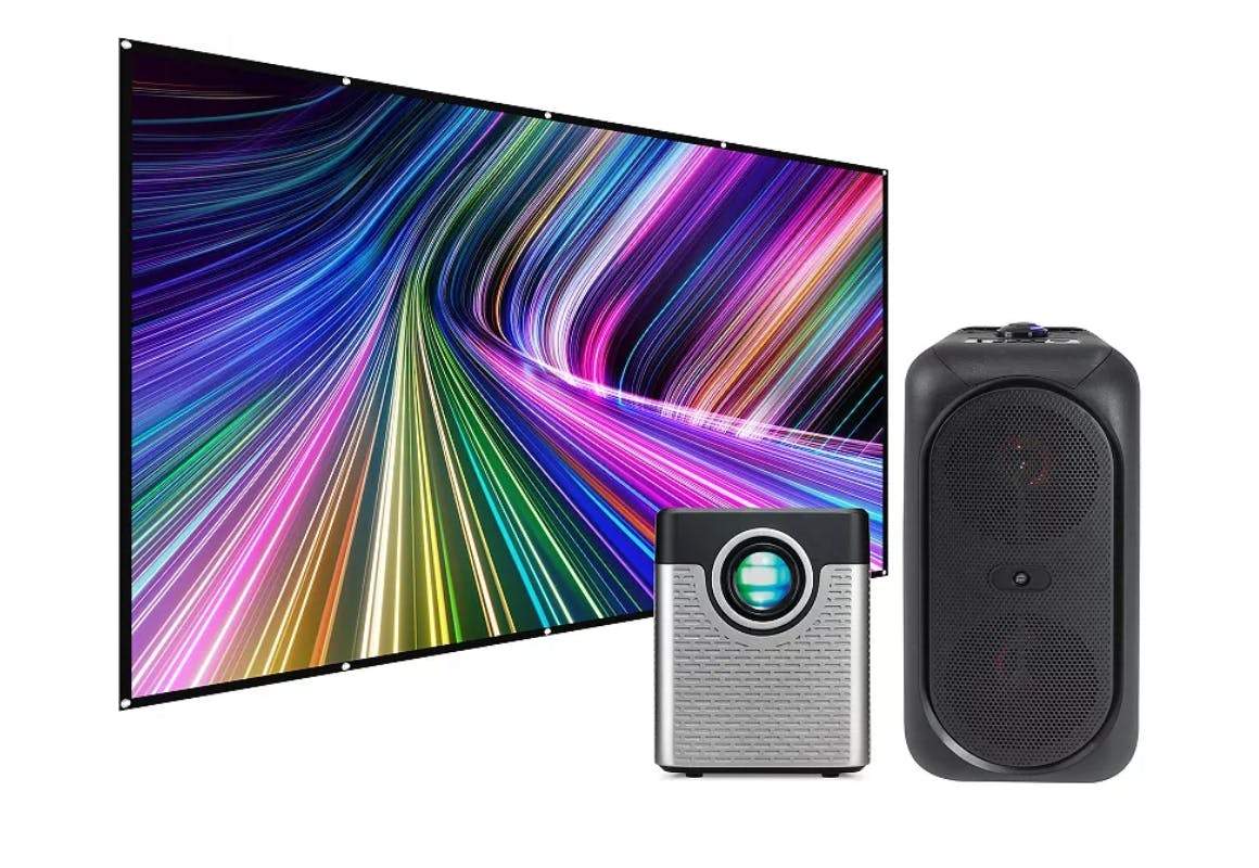 This GPX iLive Movie Theater Projector Set includes a mini projector, an indoor soft projection screen, a Bluetooth tailgate speaker, a remote control, and a power adapter. You’ll also receive rope and adhesive wall hooks.