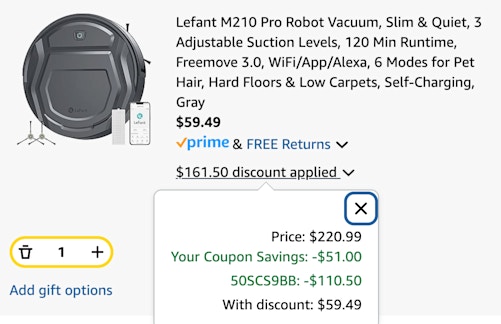 This robot vacuum cleaner was $220.99. You can bring the price down to $53.50 with a coupon and a promo code. Clip the $51 coupon on the product page, then add code 50VHSEIK at checkout. Click "Change" in the payment method section to make the promo code box appear.