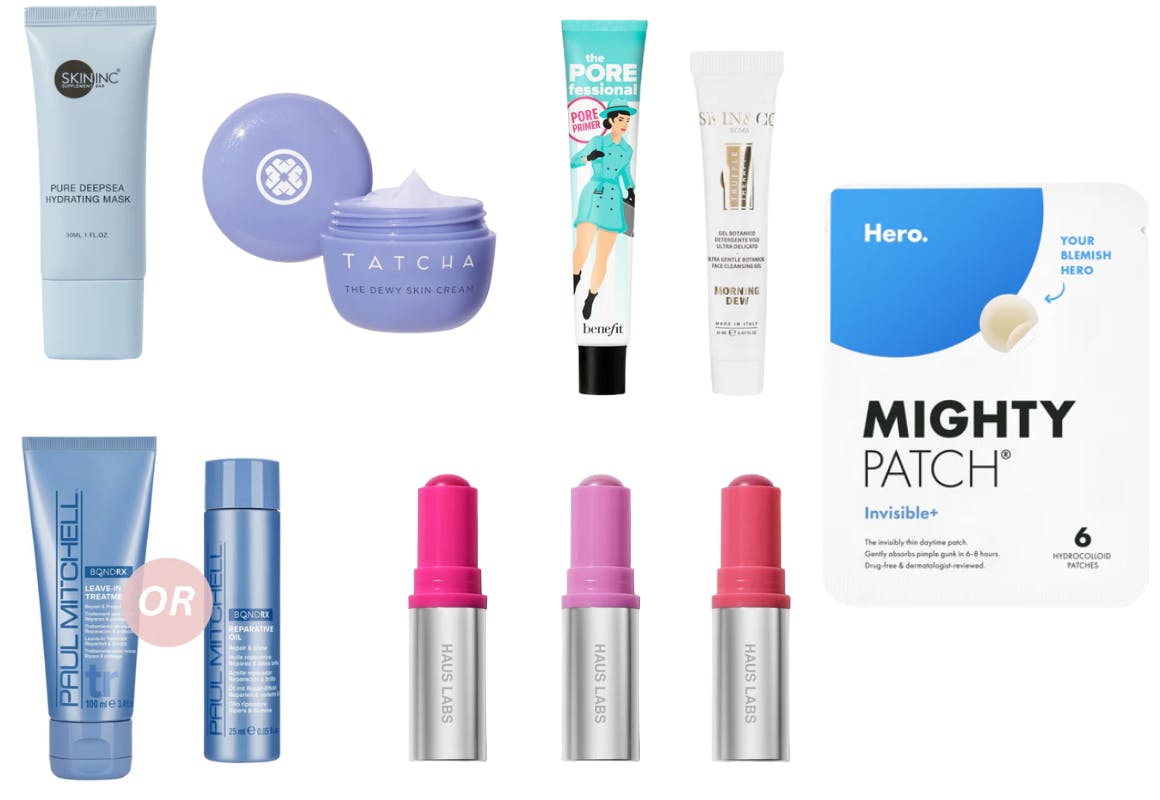 The total value of this box is $85. You’ll receive a Haus Labs blush stick (you can choose from three colors), a Paul Mitchell leave-in treatment or oil, a Tatcha moisturizer, a Skin Inc face mask, a Benefit Cosmetics makeup primer, a Skin & Co cleansing gel, and a 6-pack of Hero Cosmetics pimple patches.