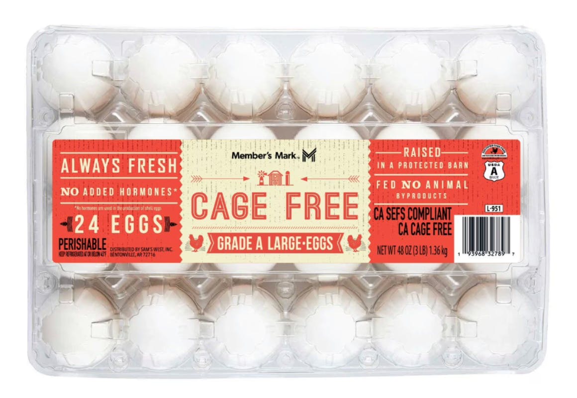 Egg prices are continuing to drop in most stores, and a 2-dozen pack of Member's Mark Cage Free eggs is currently priced at just $4.22. That means you'll get 24 eggs for just $0.18 each.