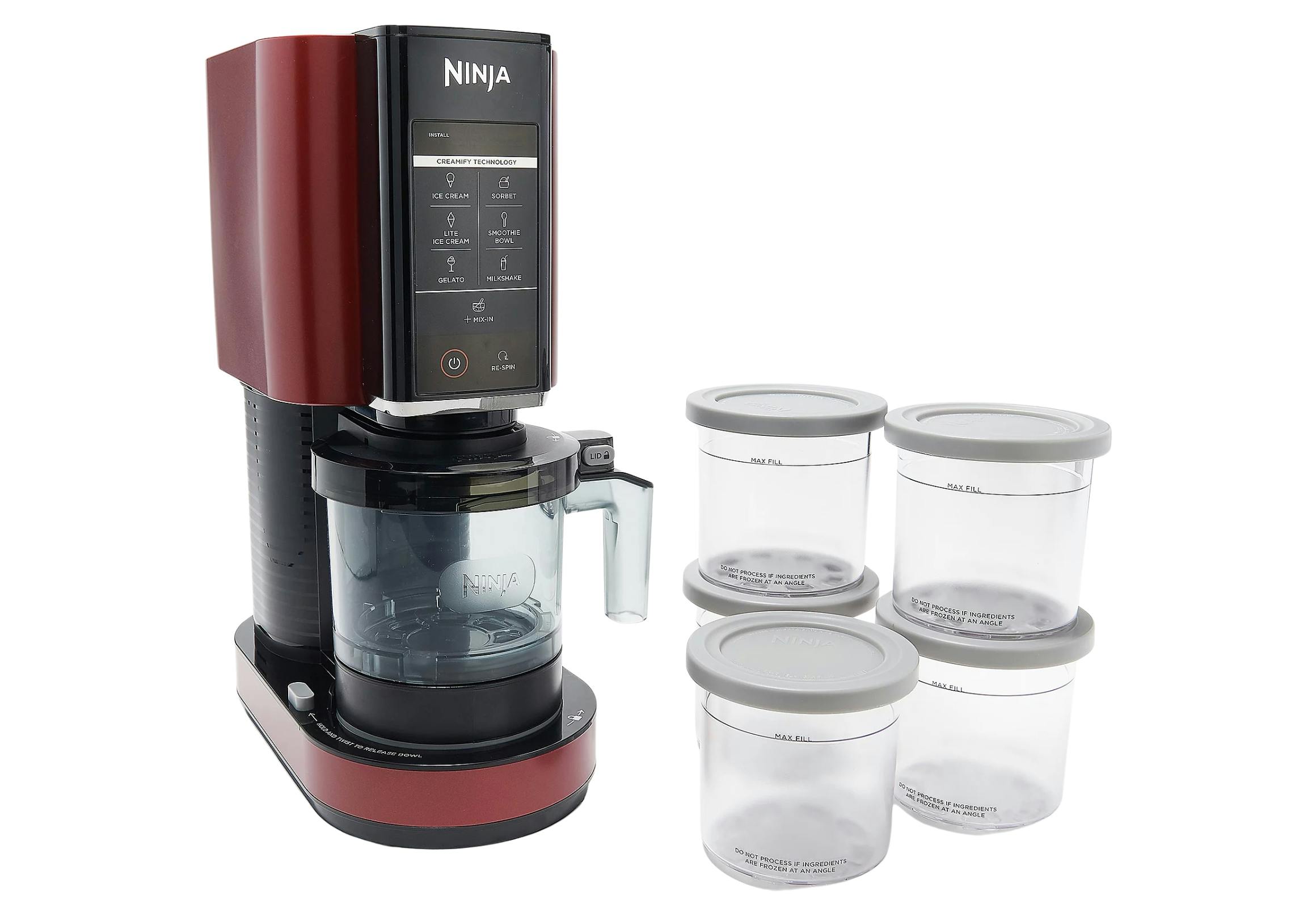 This Ninja Creami machine comes with five 1-pint bowls and five pint lids. It also comes with 30 recipes. It has seven different programs: ice cream, sorbet, gelato, smoothie bowl, milkshake, lite ice cream, and mix-in. The paddle, lids, and containers are dishwasher safe.